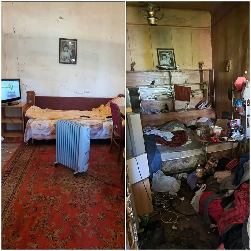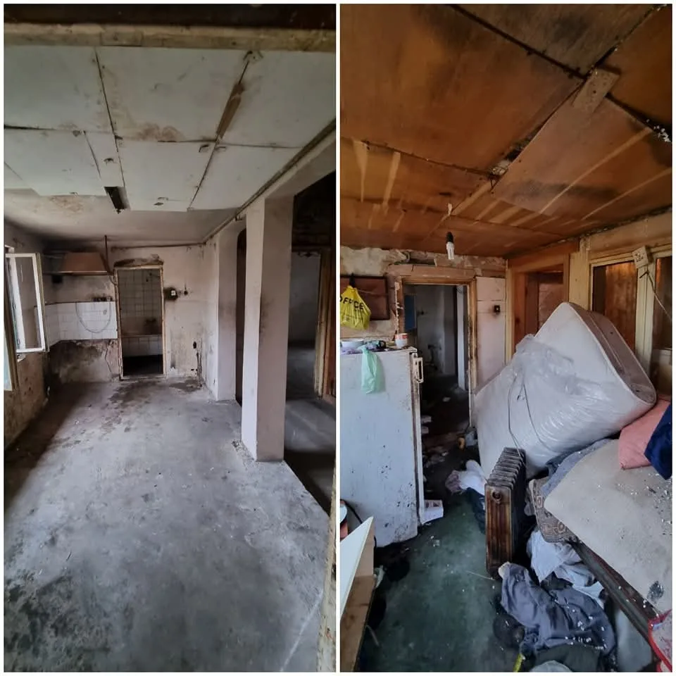 Igienizarea completă a casei, aruncat tot, făcut curat, spălat și deratizat, remobilat.